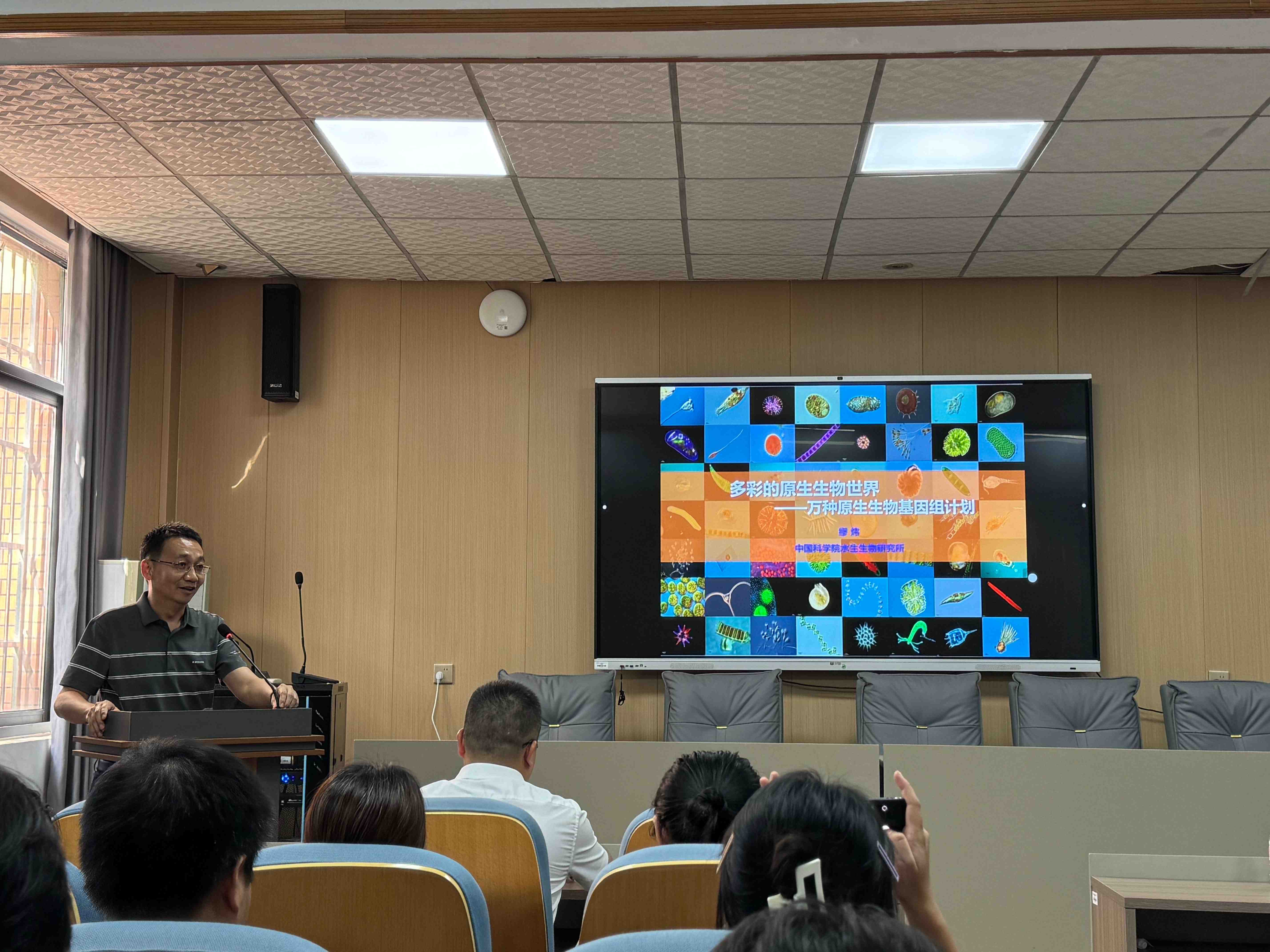 在生物楼105学术报告厅,缪炜所长为永利师生作了题为“多彩的原生生物世界——万种原生生物基因组计划”的专题学术报告。报告中,缪炜研究员从基础形态分类、单细胞测序到大规模组学数据分析和宏基因组数据挖掘等技术层面,系统介绍了其团队开发并创建的原生动物种质资源库和遗传资源库。基于这些资源,团队开展了涉及反刍动物瘤胃共生纤毛虫作用机制、原生动物新型细胞骨架及其快速运动的分子机理解析等重要领域的科学研究工作,为水生生物多样性监测、生态系统评价、环境污染物监测与降解、农业病虫害防治、生物饵料等生产实践应用提供了重要理论基础。报告内容前沿丰富,师生反响热烈。此次活动有效促进了永利与顶尖科研院所的学术对话,拓展了师生在微观生命世界探索中的视野。