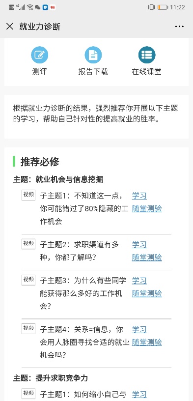 你可以在点击“在线课堂”图标跳转到就业力提升课程模块进行自助学习,并且进行测验。