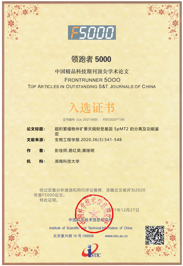 近日,国家科技部中国科学技术信息研究所公布了2020年度“领跑者5000—中国精品科技期刊顶尖学术论文(F5000)”入选名单。经定量分析遴选和同行评议推荐,永利永利集团3044彭佳师博士完成的论文“超积累植物伴矿景天镉耐受基因 SpMT2 的分离及功能鉴定”入选,该论文发表在2020年度的《生物工程学报》(第36卷第3期)上。