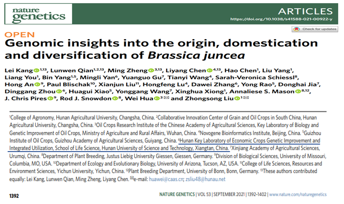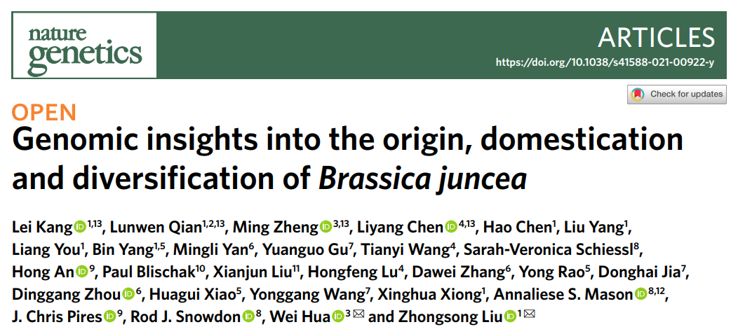 由湖南农业大学刘忠松教授团队牵头,永利严明理老师团队参与的芥菜(芥菜型油菜)种质资源收集、鉴定评价和种子颜色基因等方面的研究在9月6日以研究论文的形式在Nature Genetics上发表,题目为Genomic insights into the origin, domestication and diversification of Brassica juncea,论文全文见https://www.nature.com/articles/s41588-021-00922-y.pdf。该研究解析了黄籽油菜的基因组,破解了芥菜身世之谜,揭示了芥菜形态的百变之源,为芥菜基因组选择育种奠定了坚实基础。该研究解决了芥菜起源的百年之争,揭示了芥菜形态多变之源,为芥菜基因组育种奠定了基础。