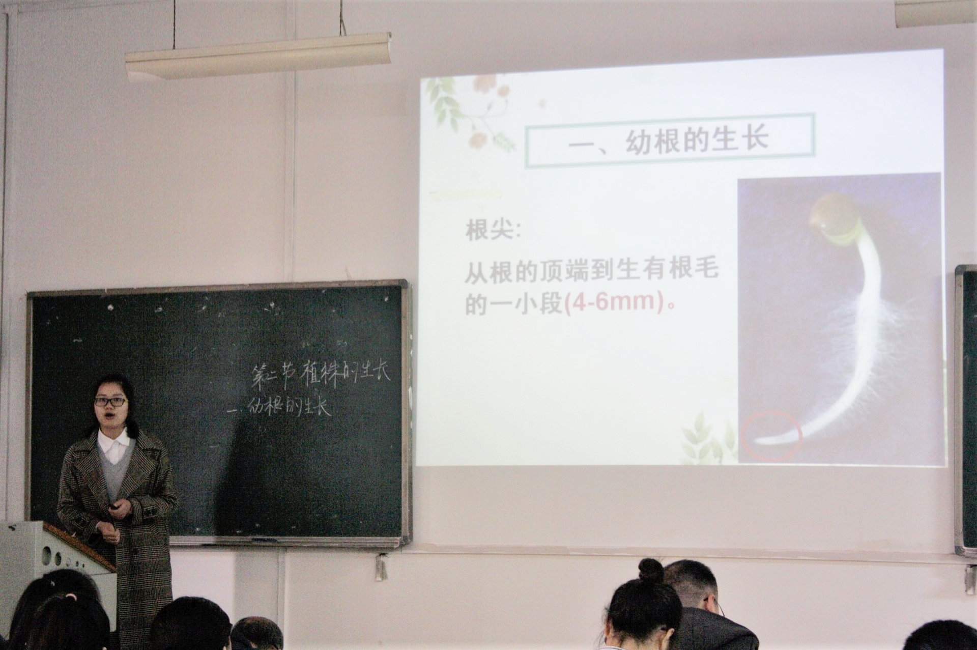 选手付丽荣讲课主题为植株的生长。随着一声洪亮的同学们,上课,所有学生的注意力都集中到了她的身上。她通过与台下同学的互动引出主题,又将主题分为幼根的生长芽的生长两部分分别展开。讲课过程中,付丽荣选手语言流畅、神色从容淡定,并且注重借助道具辅助授课。比赛进行的十分顺利,台下响起了热烈的掌声。