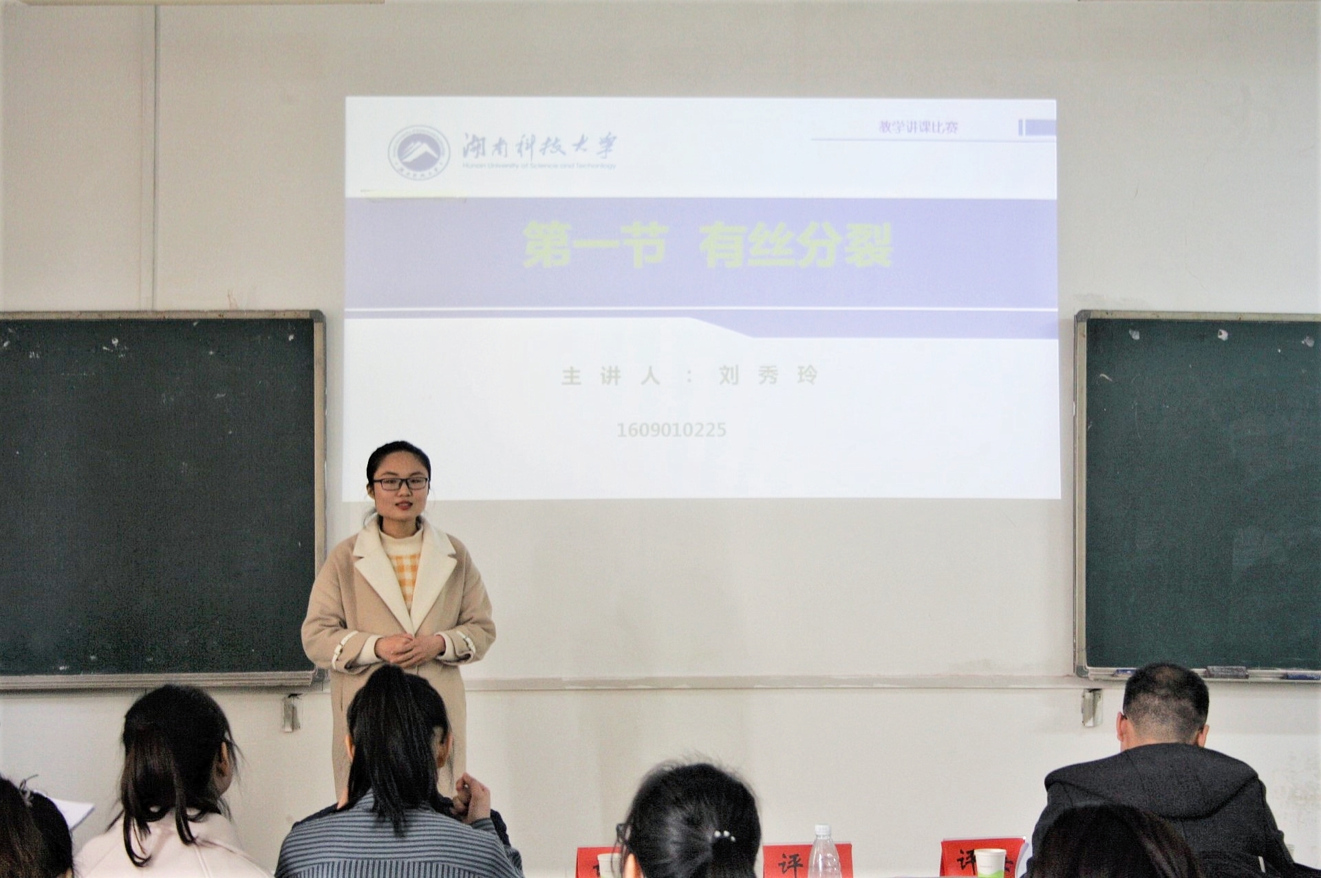 而刘秀玲则是用幽默风趣的语言对有丝分裂进行了详细的讲解。首先讲述了染色质、染色体、染色单体之间的关系,之后以视频与PPT结合的方式介绍了有丝分裂各个时期的特点。语言形象生动、易于理解,台下的同学们听的非常认真,不时传来阵阵掌声。