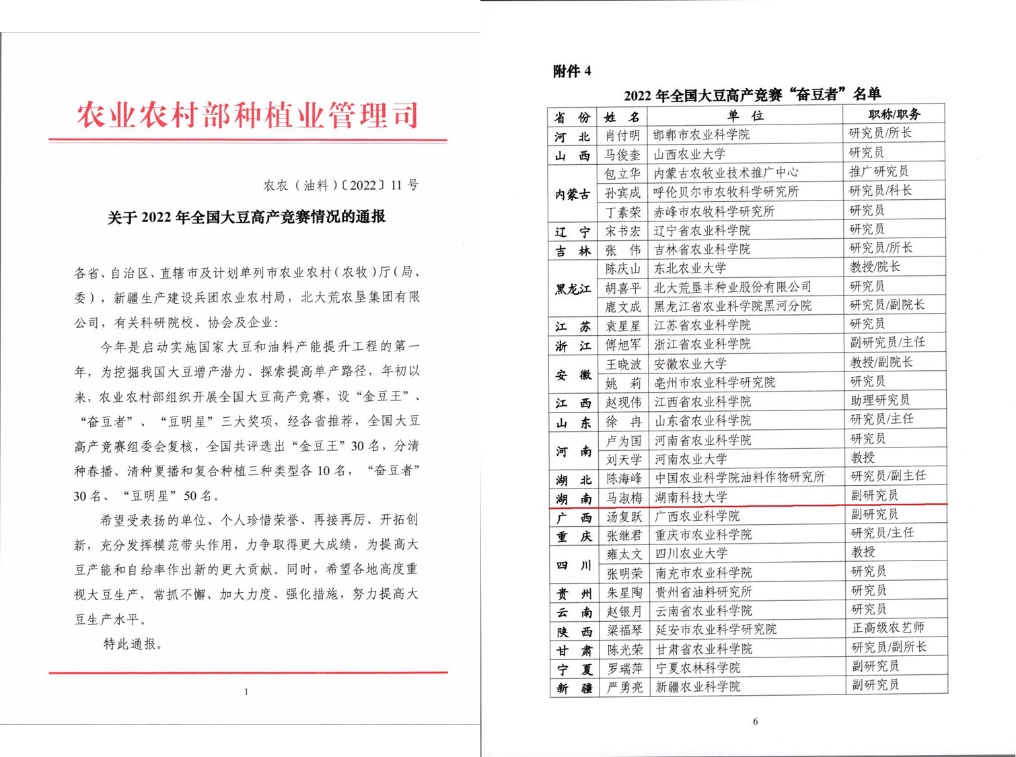 12月30日,农业农村部种植业管理司发布了《关于2022年全国大豆高产竞赛情况的通报》,永利马淑梅副教授(原副研究员)荣获“2022年全国大豆高产竞赛“奋豆者”奖项。
