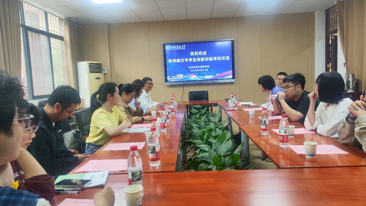 2025年4月23日,株洲南方中学生物学教研组一行来校交流,进行关于中学教育教学研究的交流和合作。院领导周定港教授、学科教学(生物)教育专业硕士点负责人彭喜旭教授、生物科学(师范)专业系主任张继红副教授等参加。